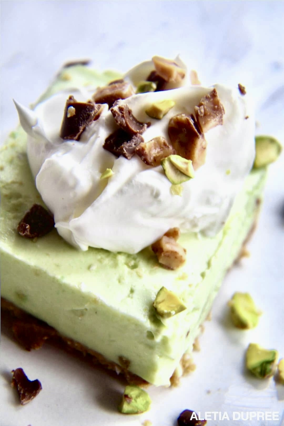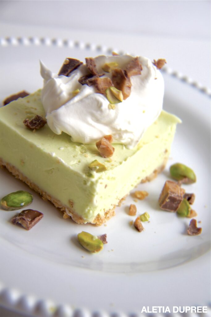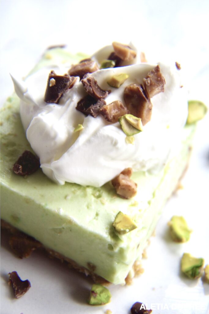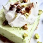 This fabulous frozen dessert is a cool, refreshing treat with a delicious pistachio flavor that’s topped with whipped cream, chopped pistachio nuts and chocolate-covered toffee candy bars!