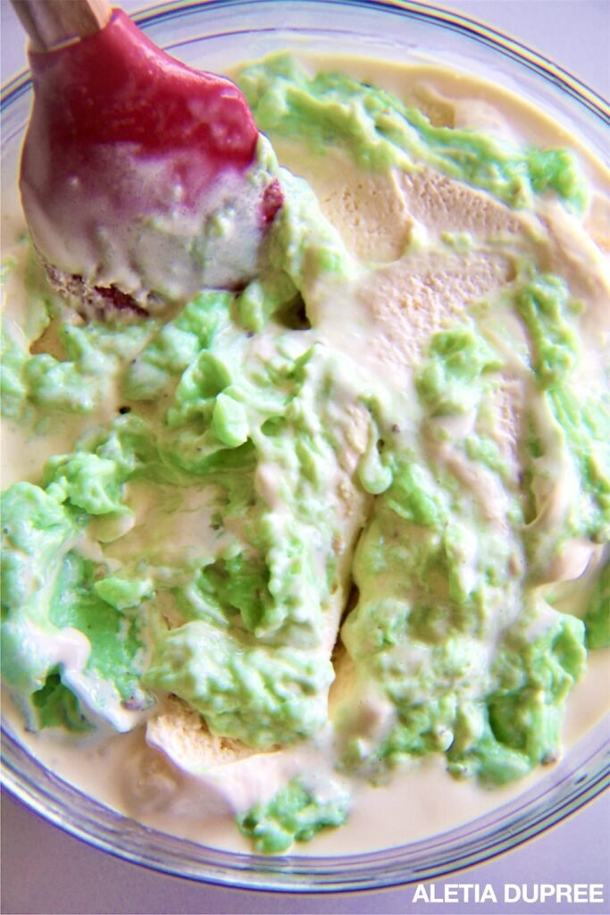 3. Next, gently fold the softened vanilla ice cream into the pistachio pudding.