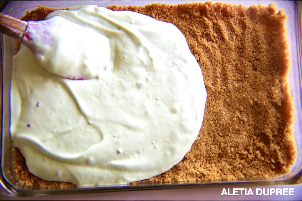 1. To make the crust, you’ll need two cups of crushed Ritz crackers and 1 stick of melted butter. Mix all together and press the crumb mixture into a 9 x 13 inch baking dish and bake for about 6 to 7 minutes at 350 degrees.