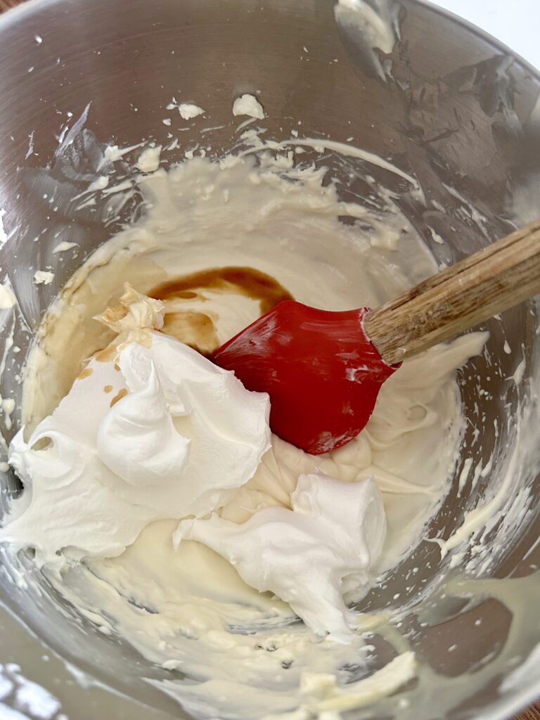 - Gently fold in the vanilla extract and Cool Whip using a spatula or wooden spoon until light and smooth.