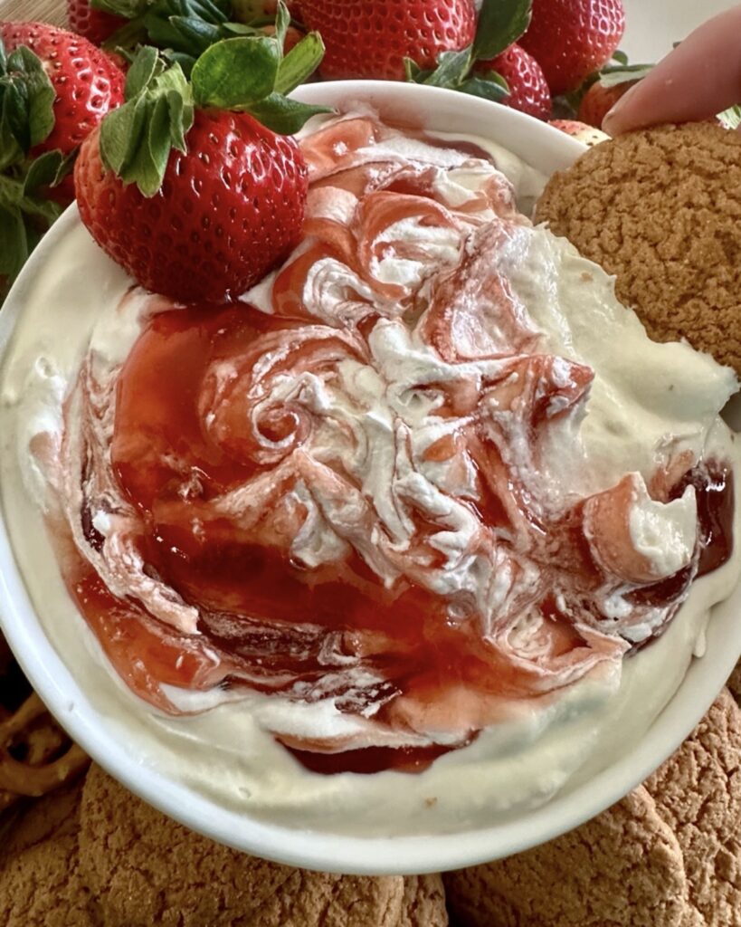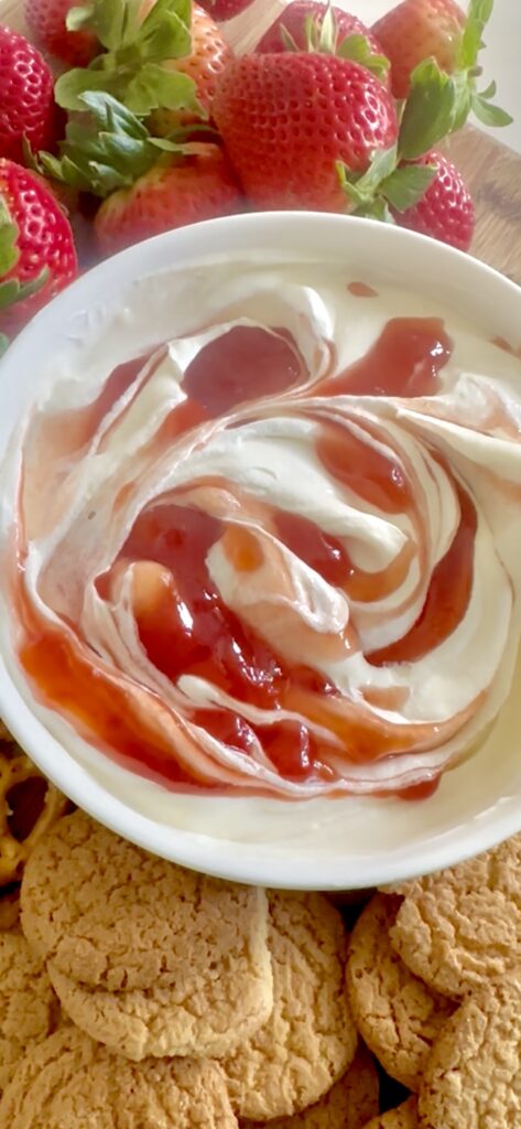 It’s delicious served with fresh strawberries, graham crackers, vanilla wafers, or even pretzels for a sweet-and-salty twist. The creamy texture paired with that beautiful strawberry swirl makes it look like you spent far more time on it than you actually did.