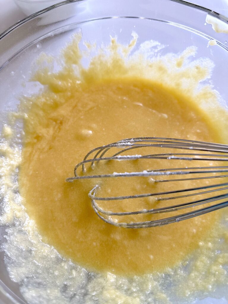 - Add the melted butter, buttermilk and vanilla extract. Whisk until smooth and fully combined.